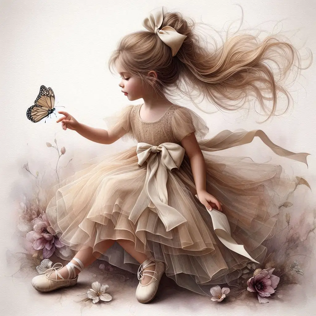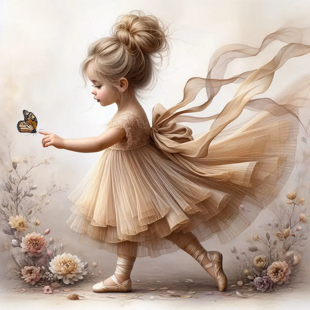 A beautiful little girl, golden hair pulled up in a messy bun silk long bow, wearing a soft chiffon layered dress, with long silk bow, in tans and cream, cream colored little silk ballerina shoes, reaches out to a small butterfly,flowers around, muted bg, highly detailed wispy and ethereal. hyper realistic 3D HD watercolor alcohol ink